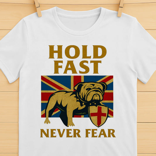 Hold Fast Never Fear T-Shirt | English Bulldog Union Jack Shield Tee for Men